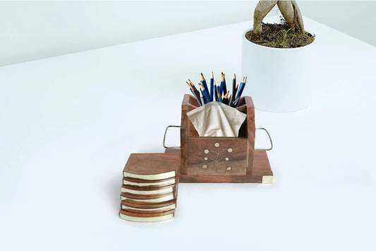 Wooden Handmade Pen Stand and Drink Coasters - Set of 6
